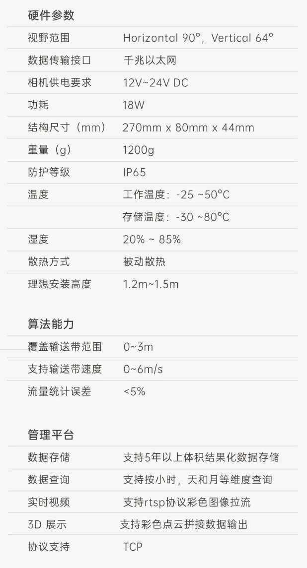 首页 动态 端到端 更易用丨欧博®散料运输动态监测与预警系统全新上市 端到端 更易用丨欧博®散料运输动态监测与预警系统全新上市 新品上市 2025-02-20 浏览量:164 在各类涉及散料运输的行业场景中,普遍面临着诸多棘手问题,严重影响生产效率、成本控制以及生产安全,作为具备端到端能力的 3D 视觉智能化解决方案专家,欧博机器人公司正式推出软硬件一体化智能散料运输动态监测与预警系统,护航全场景散料运输,助力多行业生产效率提升。 方案介绍 欧博®散料运输动态监测与预警系统 司眸® RGBD 智能相机 司眸®VAE020-800-X180是欧博机器人公司最新自主研发的升级款 工业级RGBD感算一体式智能相机产品,基于双目散斑结构光感知技术,异构3D实时成像技术提供更精细的深度感知,在SLAM、三维重建技术加持下,提升点云数据精度和图像处理能力,升级的增强光学投射系统,缩短曝光时长,减少运动模糊,更适用于高速场景。 智能料流检测软件 欧博公司智能料流检测软件,内置自研高精度料流测量算法,可全面监测输送带的运行速度、流量体积、堆料高度、块料大小、欠载状态、皮带跑偏等信息,实现输送带散货物流精细化监测。 监测管理平台 客户端软件支持实时视频查看、历史数据查询、实时人机交互控制。 系统功能 流量统计 司眸®VAE020-800-X180 RGBD 智能相机动态采集输送带上物料的三维数据,结合高精度流量体积测量算法,生成精准流量体积数据。 支持皮带速度:6m/s 数据查询:支持按小时、天和月等维度查询 自动测速 该方案能够自动测量输送带运动速度,确保及时发现异常,结合报警系统可防止设备故障或安全事故,同时实现料流精细化控制,优化输送调度,提升输送效率。 环境条件:需具备照明条件 覆盖输送带宽度:0 ~ 3m 块料检测 通过三维点云数据分析,能够识别自定义参数范围出现的块料,并突出标记,同时实时跟踪,并进行系统预警。 支持皮带速度:≤ 6m/s 块料参数自定义:支持 煤堆监测 实时监测料流高度,当发现料流高度过高可能导致物料堆积堵塞时,及时预警。 检测精度:毫米级 覆盖皮带宽度:0~3m 欠载检测 当检测到料流高度过低时,表明输送带此时处于欠载状态,系统可及时预警,消除生产安全隐患,提升生产效率。 检测精度:毫米级 覆盖输送带宽度:0~3m 跑偏检测 自主设定跑偏阈值,算法自动比较皮带实时偏移量和设定阈值,判断输送带是否偏离正常轨道,输出计算跑偏幅度和方向,显示具体数值,同时可及时发出警报。 检测精度:毫米级 覆盖输送带宽度:0~3m 核心优势 01 高精度测量,数据稳定输出 测量精度可达毫米级,测量结果与实际物料流量误差小于5%; 支持深度数据和RGB数据同步对齐输出; 02 超大景深,超宽视野 测量输送带宽度达3m; 测量堆料高度达1.5m; 03 部署简单,安装便捷 无需改变现场环境即可快速安装; 调试简单,系统易于维护; 04 端侧AI,架构简洁 数据传输延迟更低; 不需要额外工控机计算设备; 更省安装与维护成本; 05 一个平台,多个应用 单机实现散料皮带流量监控、堆煤、跑偏、测速等多种应用; 06 RGBD应用开发平台 司眸®RGBD智能相机可作为应用开发平台,持续衍生出更多闭环应用; 07 快速响应防爆需求 针对防爆需求,提供10mm厚度防爆玻璃解决方案,确保在防爆环境下正常使用而不影响3D成像效果; 方案能力 应用场景 Human+™欧博®深耕机器视觉领域近十年,3D 视觉 AI 技术积累深厚,经过长期自主研发,现已推出A系列、P系列,T系列、AT系列双目 3D 相机产品,基于自研 3D 相机,为客户和合作伙伴提供端到端的「3D 视觉+AI 」 自动化解决方案,打造软硬件一站式闭环服务体验。 欧博一直秉持以服务客户为中心,将技术与产品创新作为对客户、行业和社会应尽的责任。未来,Human+™欧博®将坚持探索前沿科技创新,始终致力于各行业智能化转型升级,促进全社会生产效益提升。 上一个:小尺寸 更灵活丨欧博3D相机PEA020-800-Y80S上新,助力多场景智造升级 返回列表 下一个:没有了 更多新闻推荐 小尺寸 更灵活丨欧博3D相机PEA020-800-Y80S上新,助力多场景智造升级 新品上市 2024-09-29 目前主流3D视觉技术各有什么优劣势?如何选择最Match的工业3D相机? 技术科普 2024-08-12 【最全选型攻略】挑选合适的工业相机,必须提前考虑12要素! 工业相机 2024-07-16 场景应用丨欧博智能智能煤流监测系统全新升级,赋能自动化煤流管控 场景应用 2024-07-08 场景应用丨欧博智能3D视觉+AI深度学习,助超大型货物体积测量更准,更稳,更易用 场景应用 2024-06-04 超高读取 极致易用丨欧博智能发布RGBD动态包裹体积测量智能相机 新品发布 2024-04-26
